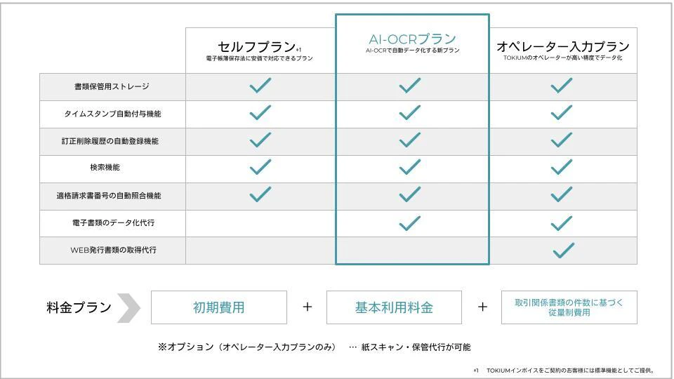 TOKIUMは、納品書や契約書などのあらゆる取引関係書類をクラウド上で管理し、電子帳簿保存法に容易に対応できる「TOKIUM電子帳簿保存」を提供しています。これまで、取引関係書類の日付や金額などのデータを自社で入力するプランと、オペレーターがデータ化するプランを提供していましたが、価格も抑えながら入力作業を軽減したいというご要望にお応えするため、AI-OCRを採用した新プランを新設しました。