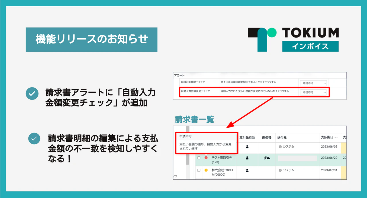 請求書アラートに「自動入力金額変更チェック」が追加されます。