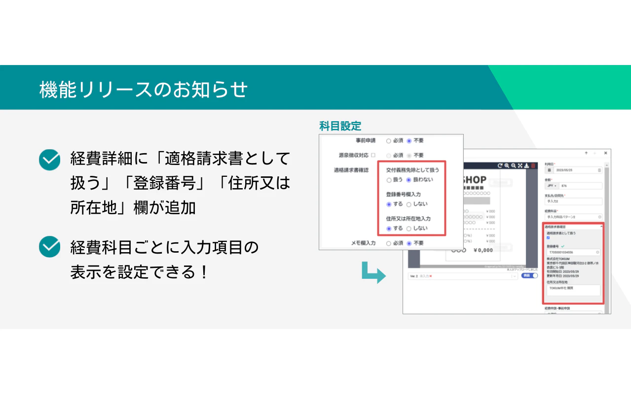 経費作成時の入力フォームに、「登録番号」「適格請求書として扱う」「住所又は所在地」の3項目が追加されます。