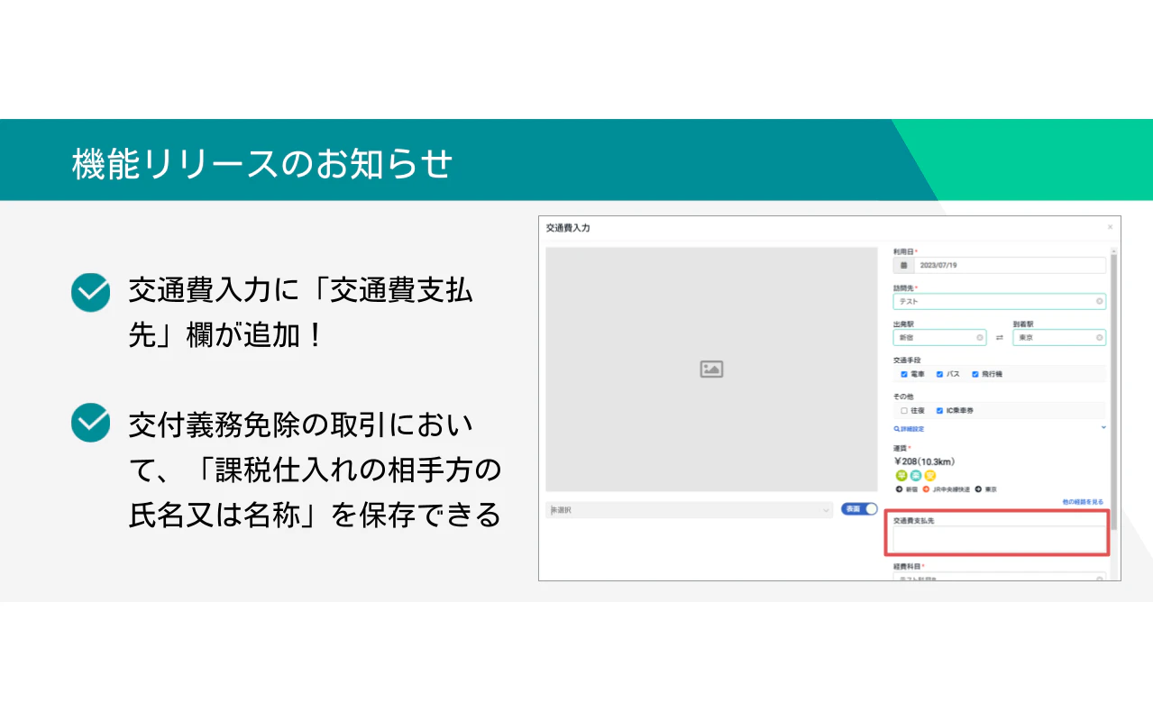 交通費入力画面に「交通費支払先」の入力欄が追加されます。