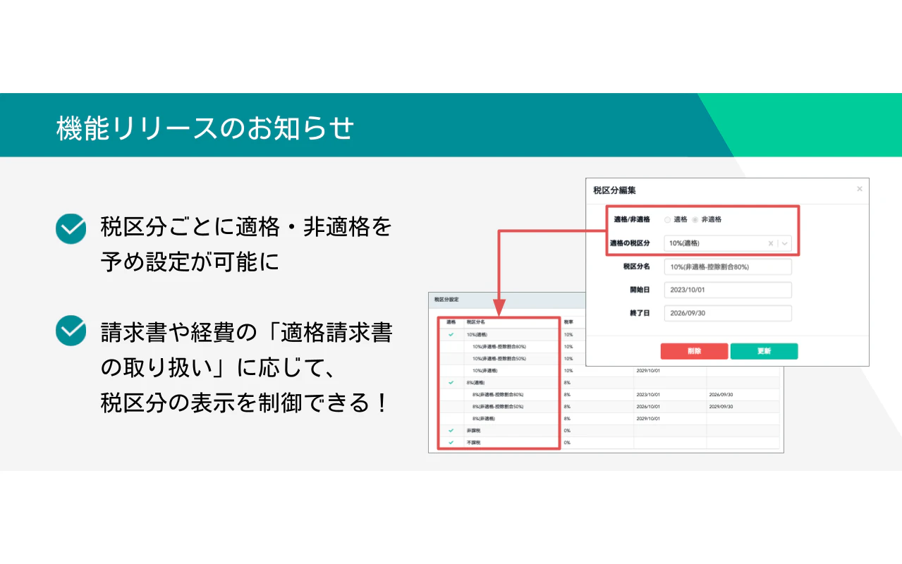 請求書や経費の「適格請求書かどうか」のチェック状況と税区分の期間設定に応じて、科目に紐づく税区分の表示を制御することが可能です。