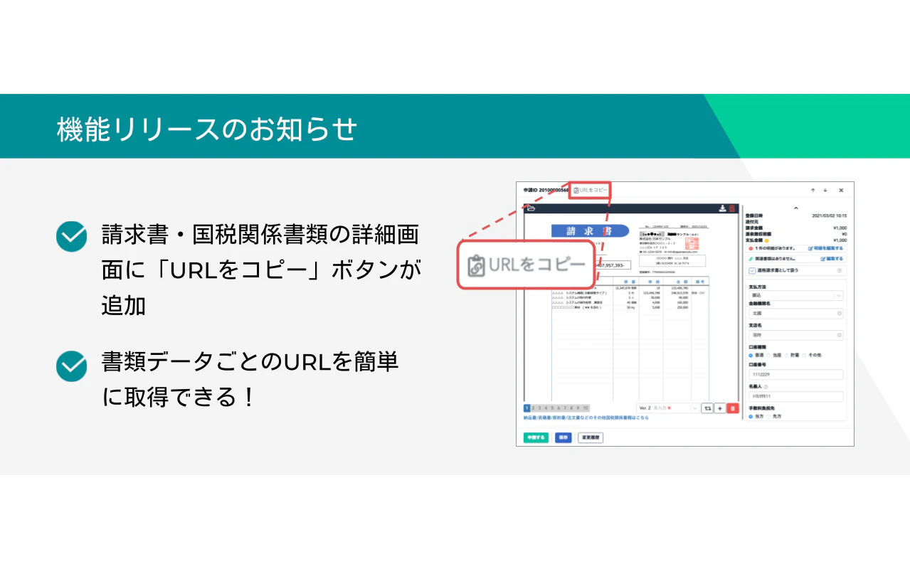 請求書と国税関係書類の詳細画面に「URLをコピー」ボタンが追加されました。