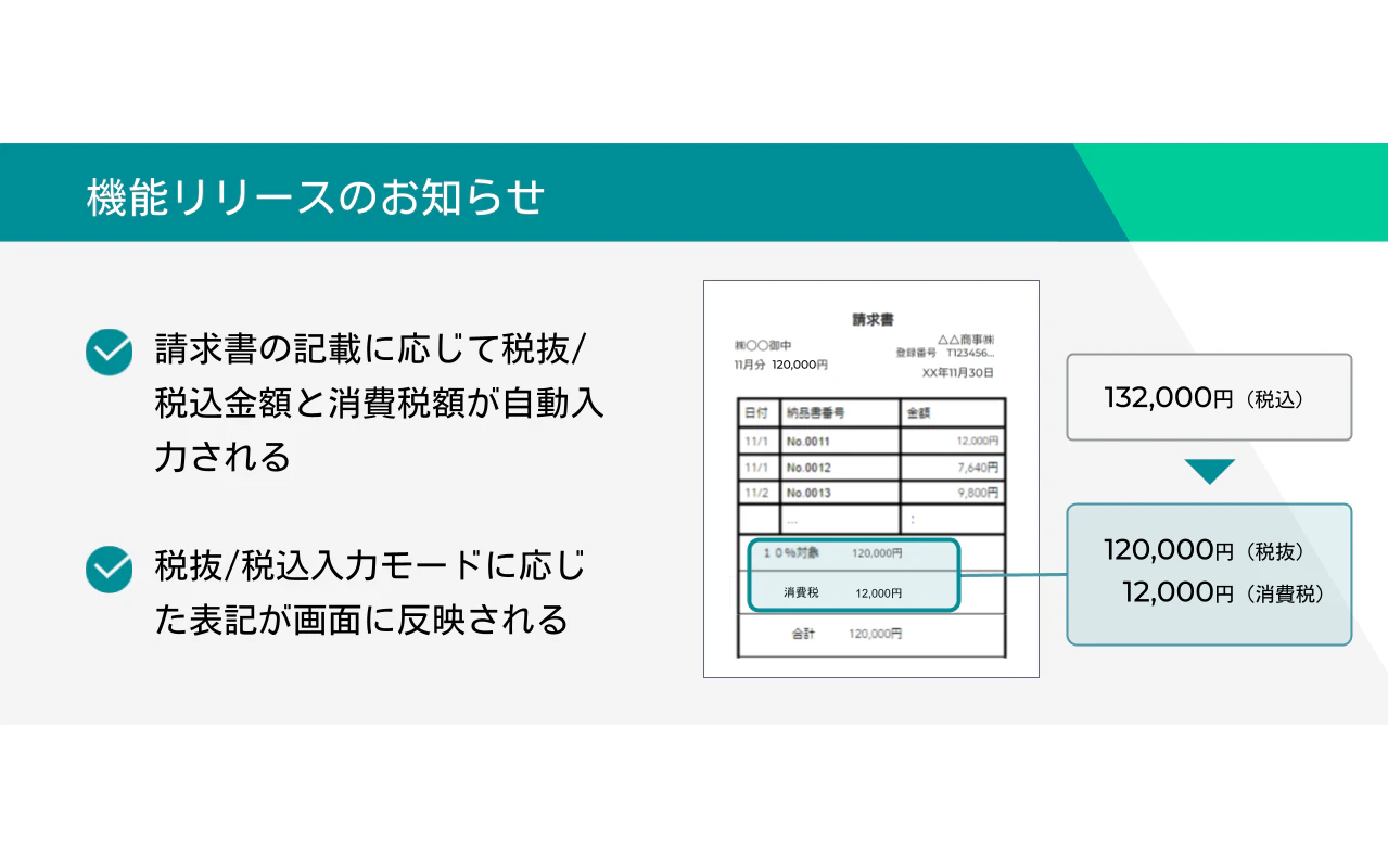 請求書の記載に応じて税抜/税込金額と消費税額が自動入力されるようになります。