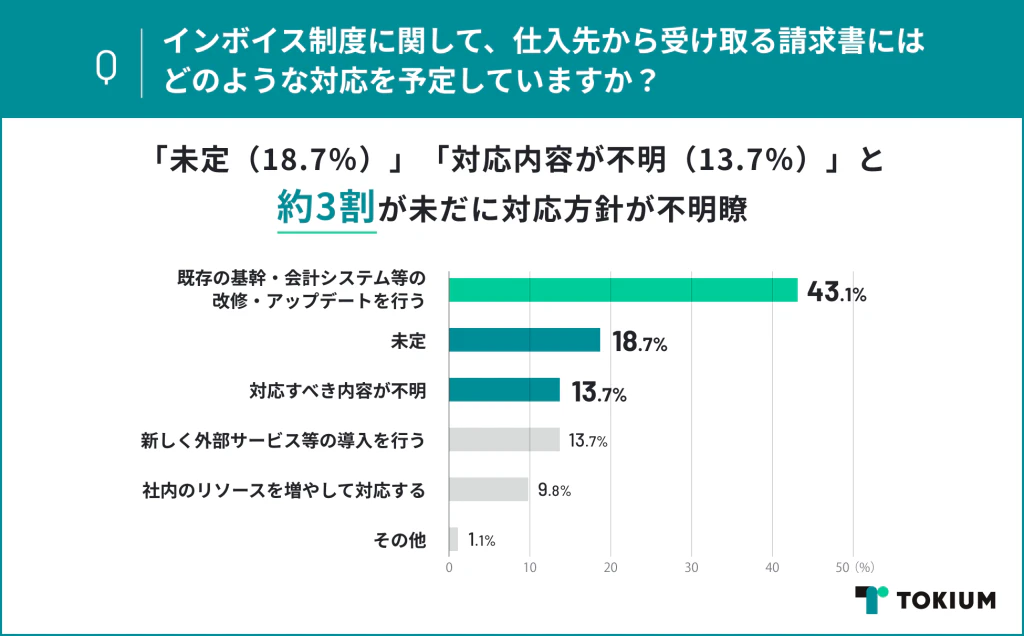 一方で、10月から制度が開始するにも関わらず、「対応すべき内容が不明」が13.7%、「未定」が18.7%と約30%がまだ対応方針を決定できていないことがうかがえます。