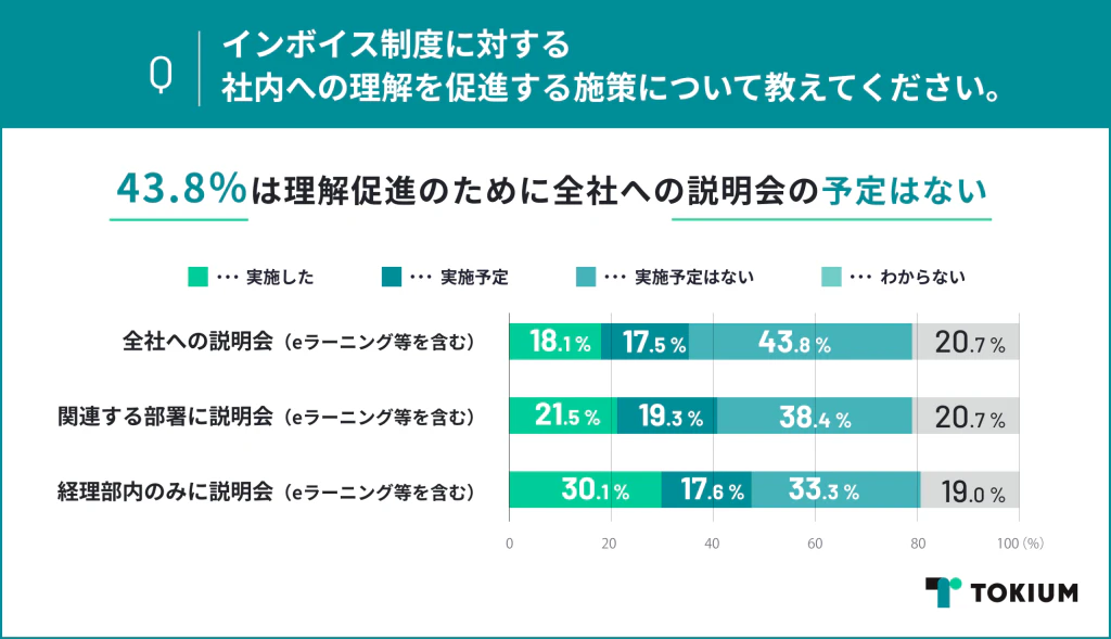 インボイス制度に対する社内への理解を促進するための取り組みについて、35.6%が会社への説明会(e-ラーニング等を含む)を実施した・実施予定と回答しました。一方で、43.8%が説明会を実施する予定がないと回答し、全社での理解促進がまだ足りていない様子がうかがえます。