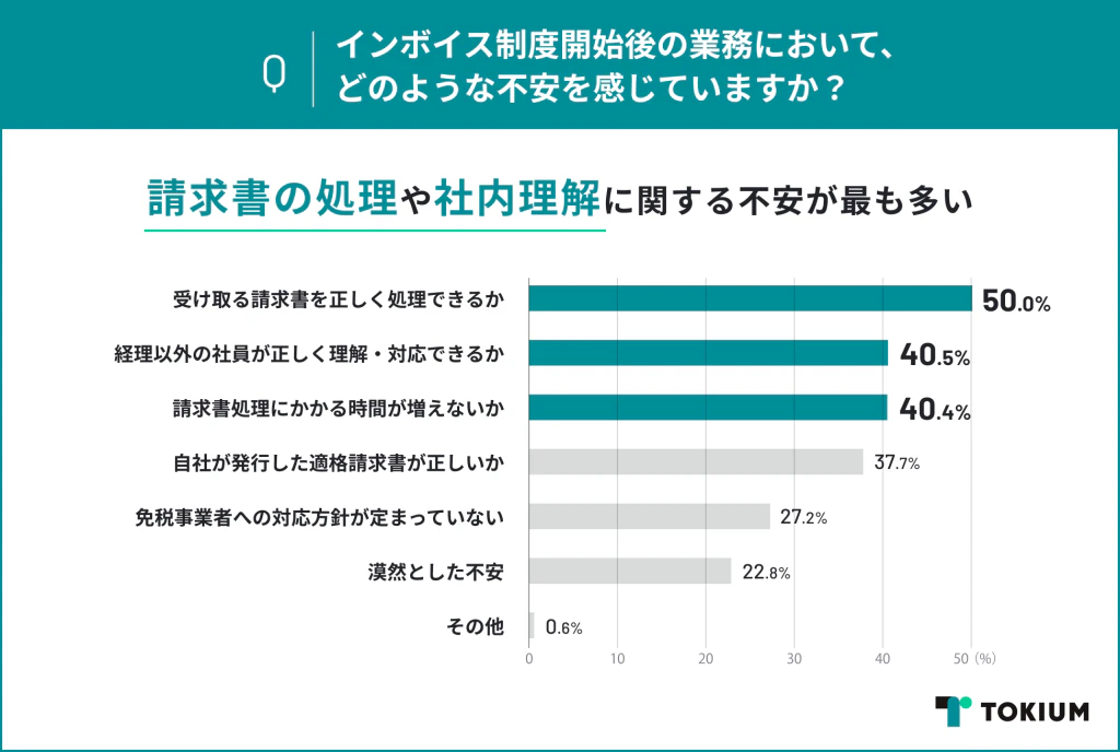 さらに、「経理以外の社員が正しく理解・対応できるか」についても40.5%が不安を抱えており、2番目に多い要因となりました。インボイス制度は、経理だけではなく全社に影響を及ぼすため、社内での理解促進や規定の浸透、従業員による適切な請求書の処理が課題となっていることがわかります。