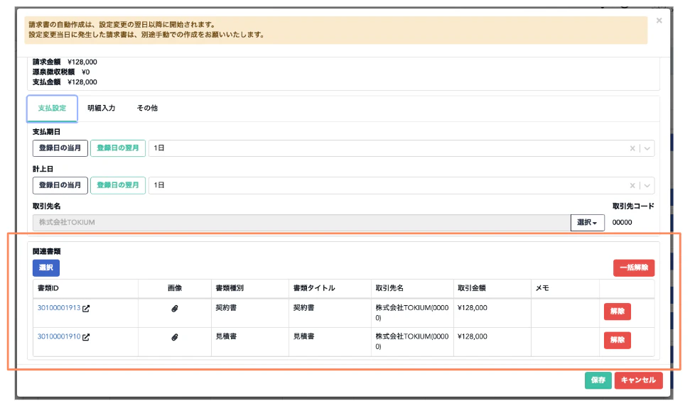 TOKIUMインボイスの定期支払の設定画面で、契約書等の関連する証憑を紐づけることができるようになります。これにより、定期支払機能で生成される請求書と証憑が自動で紐づけられます。そのため、複数の書類で適格請求書の記載要件を満たす場合にもインボイスとして対応することが可能です。