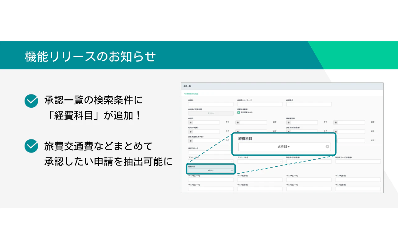 承認一覧にて「経費科目」を条件として指定して検索ができるようになりました。