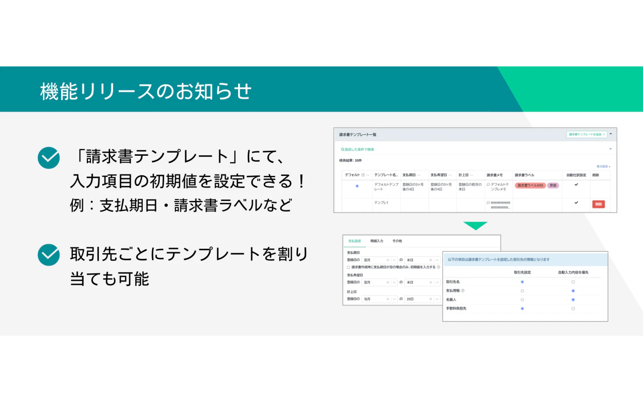 「支払期日」や「計上日」の初期値はテナント内で共通であり、取引先ごとに指定できませんでした。
