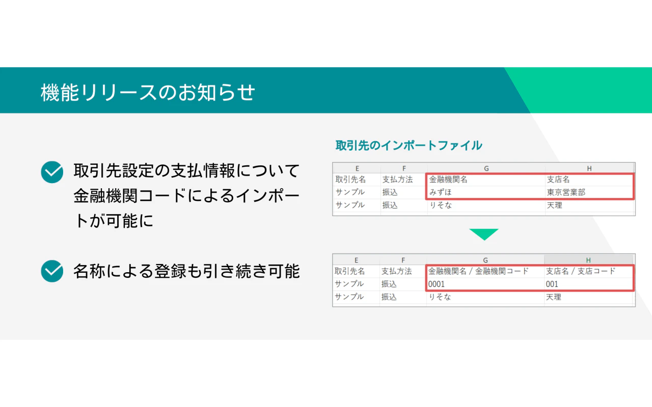 支払情報を「金融機関コード」と「支店コード」でも登録できるようになりました。