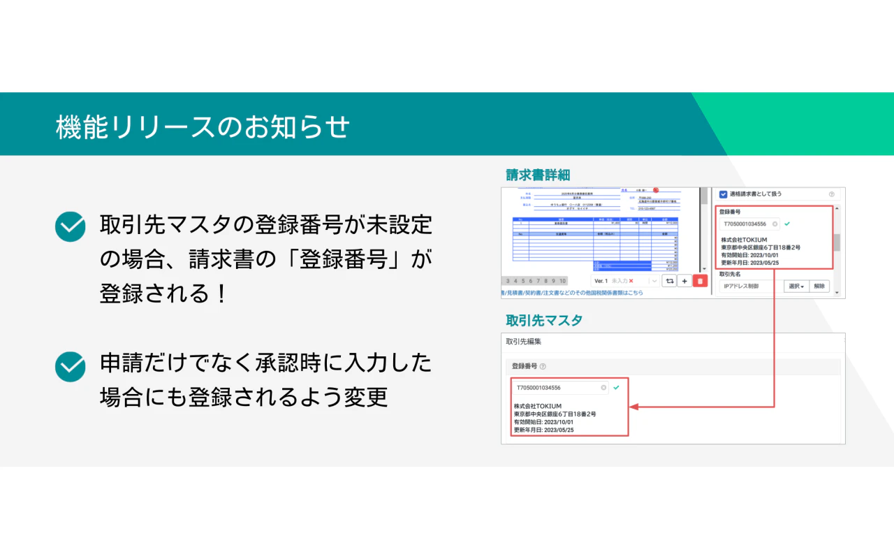 申請時だけでなく承認時に承認者が登録番号欄を入力した場合にも適用されるようになります。