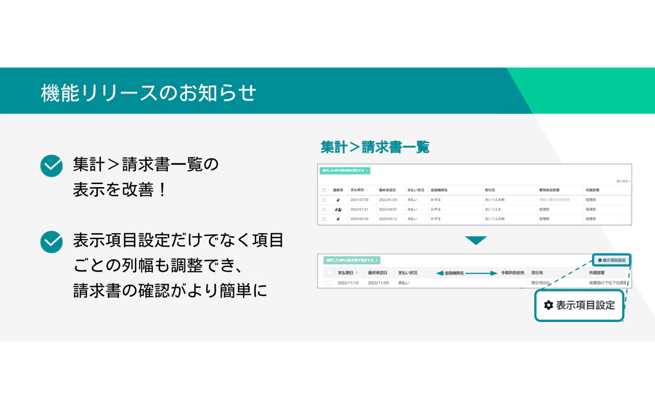 集計メニュー内の請求書一覧にて、表示項目設定と列幅の調整が可能になります。