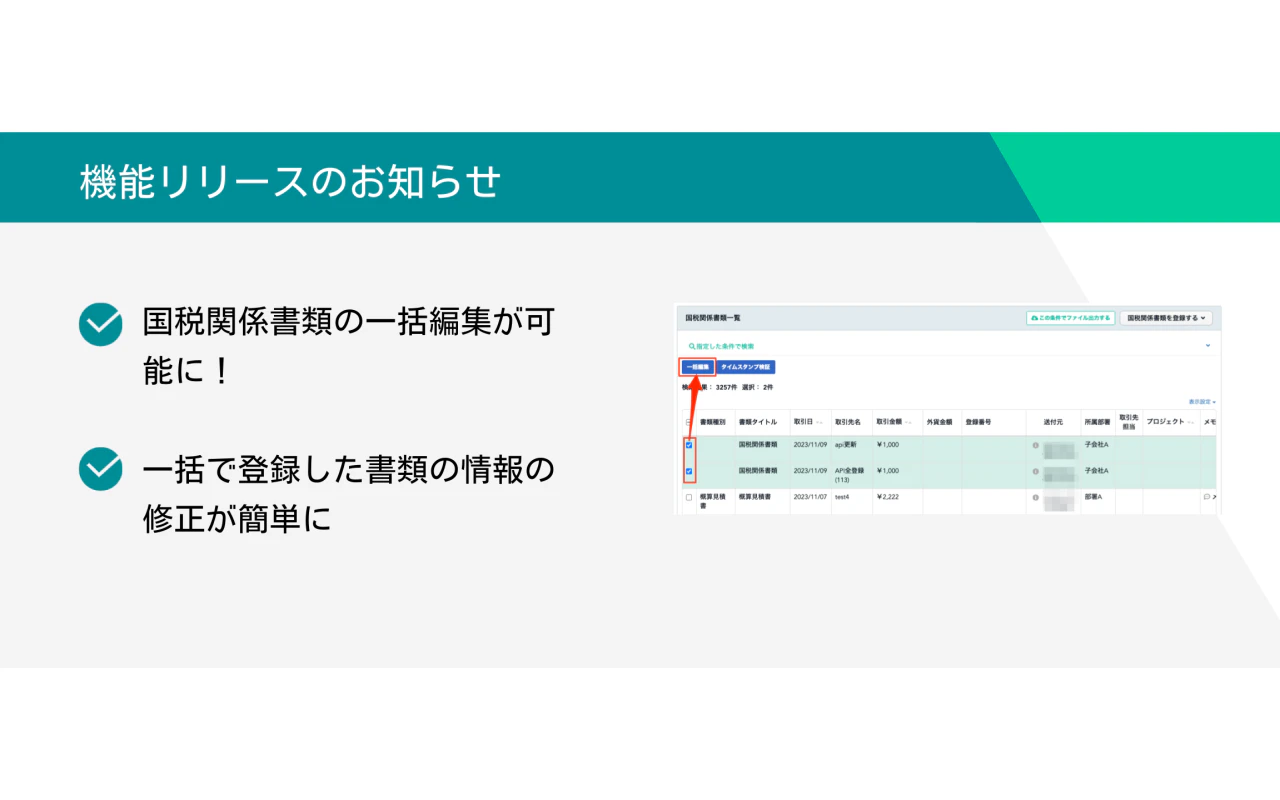 国税関係書類一覧で、複数の書類を選択して一括で編集できるようになります。