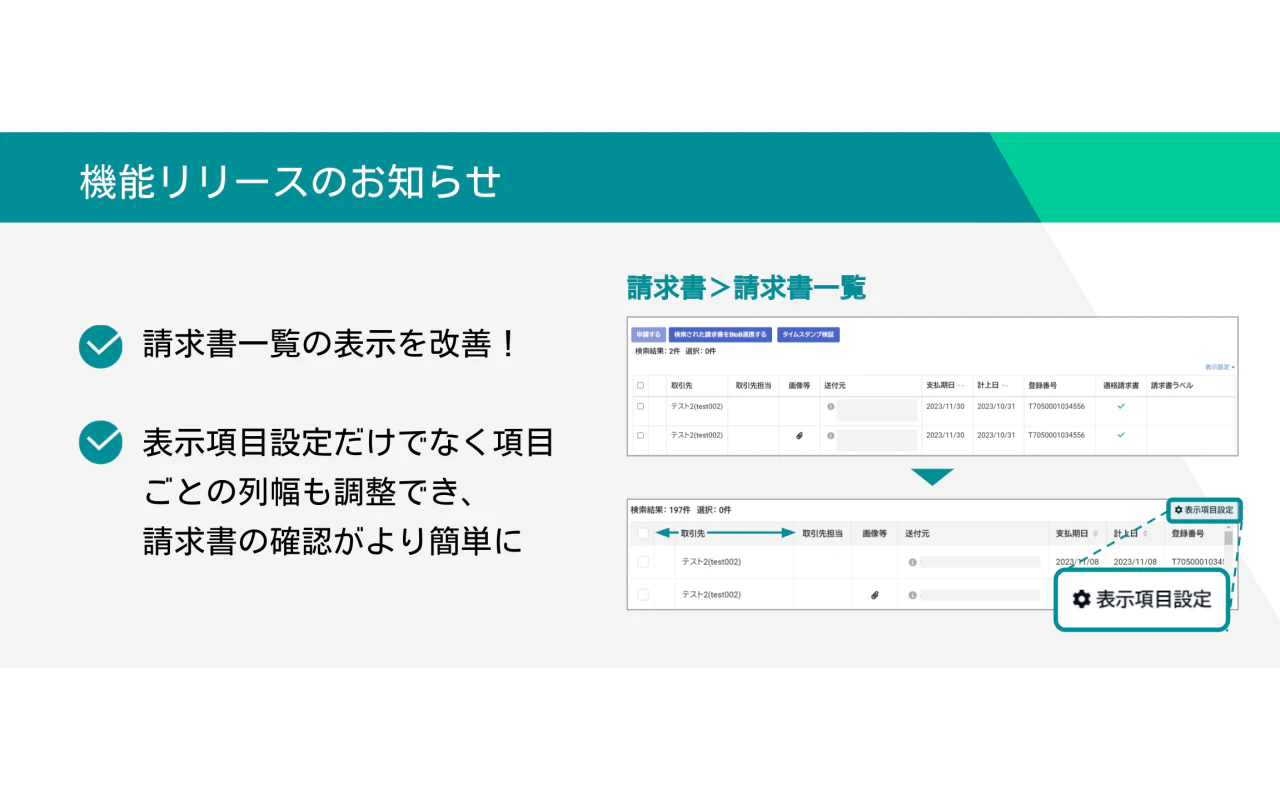 請求書メニューの請求書一覧にて、表示項目設定と列幅の調整が可能になります。