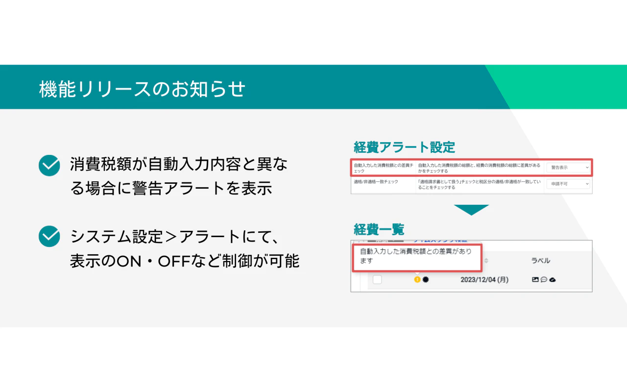 自動入力された消費税額の合計金額と、編集された経費データの消費税額の合計金額が一致しない場合に、黄色の警告アラートが表示されるようになります。