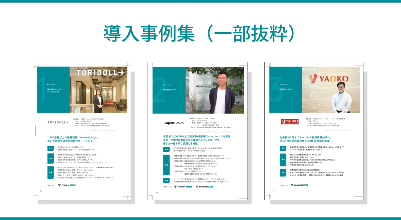 本冊子では、大手スポーツ専門店がTOKIUMを導入し、法制度への対応と年間約3万件の請求書と領収書をペーパーレス化して従業員の生産性を向上させた事例を紹介しています。また従業員数約3万人の大規模なスーパーマーケットが年間5万枚の紙の領収書をペーパーレス化し、経費精算にかかっていた年間約600時間の工数を削減した事例も掲載しています。