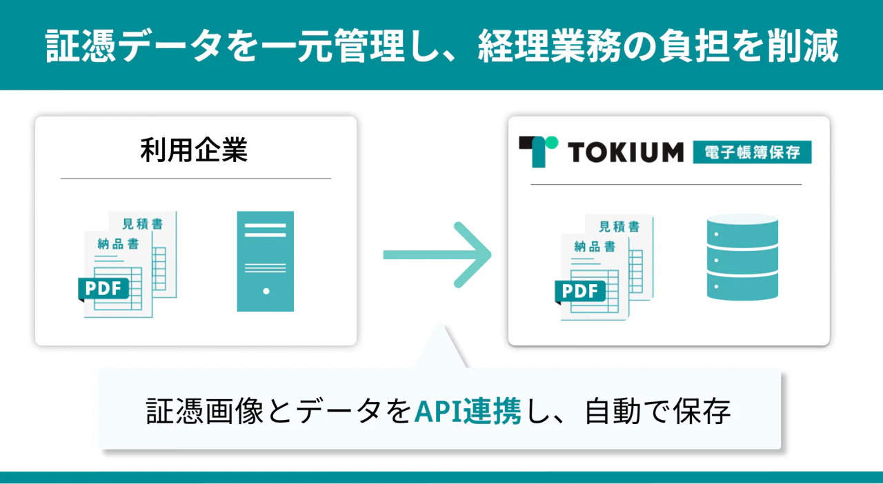 新たに提供を開始するAPIにより、顧客のデータベースとのAPI連携が可能となり、自社で保有している証憑画像と証憑データ(取引年月日、金額、取引先)をTOKIUM電子帳簿保存に直接連携することができるようになります。これにより、TOKIUM以外のシステムを利用して保存した証憑データをTOKIUM電子帳簿保存に保存し直す必要がなくなります。また、証憑データを一元管理することにより、企業の経理業務の効率化を図ります。
