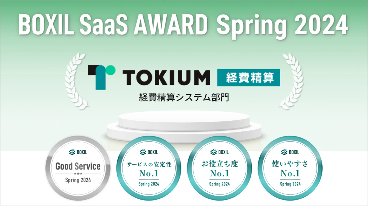未来へつながる時を生む支出管理クラウドTOKIUM(トキウム)を提供する株式会社TOKIUM(本社:東京都中央区、代表取締役:黒﨑 賢一、以下「TOKIUM」)は、スマートキャンプ株式会社(以下「スマートキャンプ」)が主催する「BOXIL SaaS AWARD Spring 2024」において、TOKIUM経費精算が経費精算システム部門において「Good Service」「サービスの安定性No.1」「お役立ち度No.1」「使いやすさNo.1」を受賞したことをお知らせします。