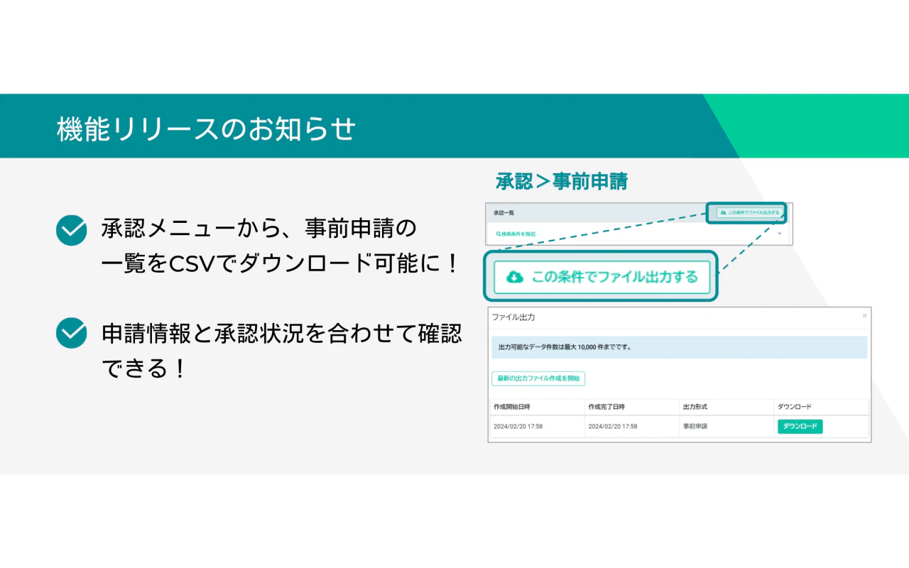 承認メニューの[事前申請]にCSVデータのダウンロードボタンが追加されました。