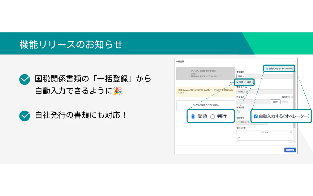 また、本機能を利用して登録する場合は、自社発行の書類と受領する書類の切り替えも可能になります。