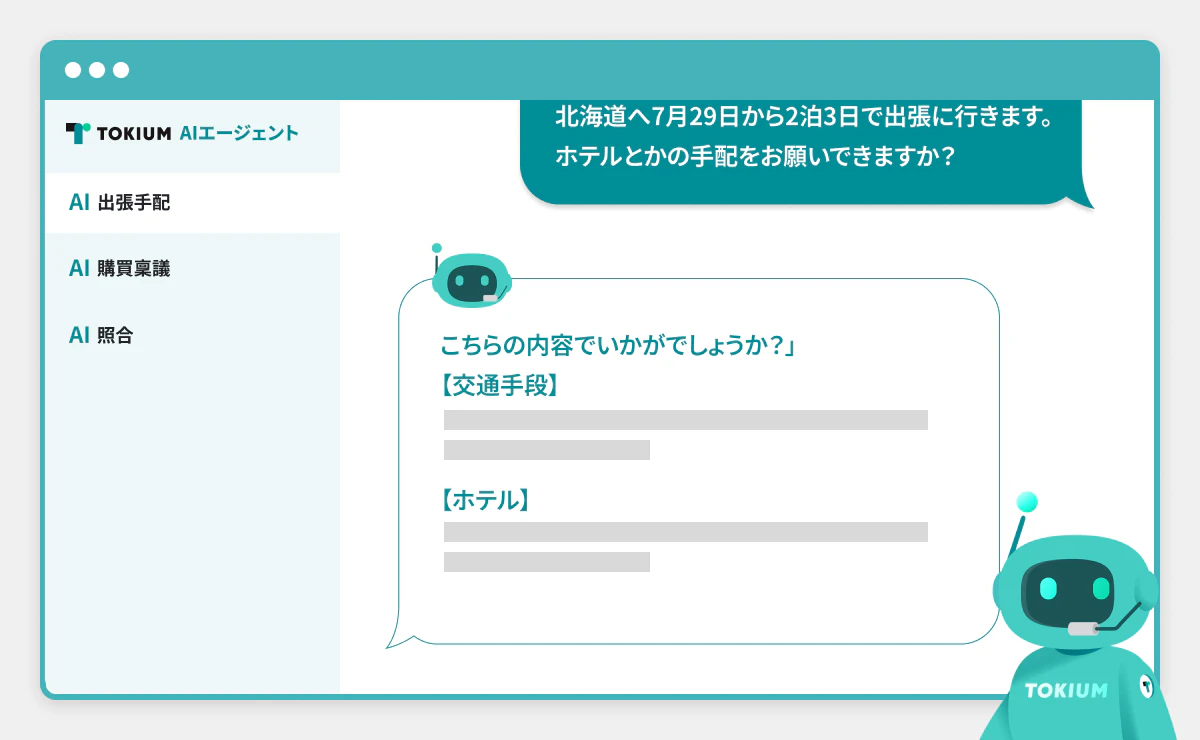 「TOKIUM AI出張手配」は、日常的な言葉でチャット形式で依頼するだけで、最適な移動ルートやホテルの提案、出張の事前申請の作成までを一貫してAIエージェントが実行するサービスです。さらに、AIがプロスタッフと連携し、申請に基づいて予約まで完了できます。