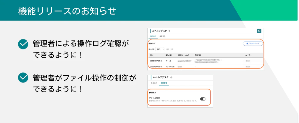 ユーザーがサービス内で実行した操作(質問内容・AIによる回答結果・ファイル操作)を確認できるようになりました。さらに、操作の履歴はCSV形式でダウンロードすることが可能です。