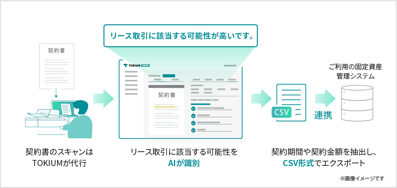 本機能は、新リース会計基準にしたがってリース取引に該当する可能性をAIで識別します。契約書から読み取った契約期間や契約金額などはCSVで出力可能なため、固定資産管理システムとの連携が容易になります。これにより、リース取引の識別から固定資産管理システムへの取り込みまでがスムーズに行えるため、新リース会計基準の対応を効率化できます。