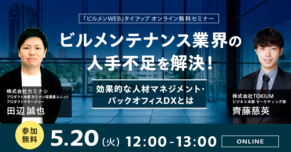 経費精算や請求書処理などの支出にまつわるクラウドサービスを提供する株式会社TOKIUM(本社:東京都中央区、代表取締役:黒﨑 賢一、以下「TOKIUM」)は、公益社団法人全国ビルメンテナンス協会(本部:東京都墨田区、 会長:佐々木 浩二、以下「ビルメンテナンス協会」)と、現場DXプラットフォーム『カミナシ』シリーズを提供する株式会社カミナシ(本社:東京都千代田区、代表取締役:諸岡 裕人、以下「カミナシ」)との共催で、5/20(火)12時よりオンラインセミナーを開催します。