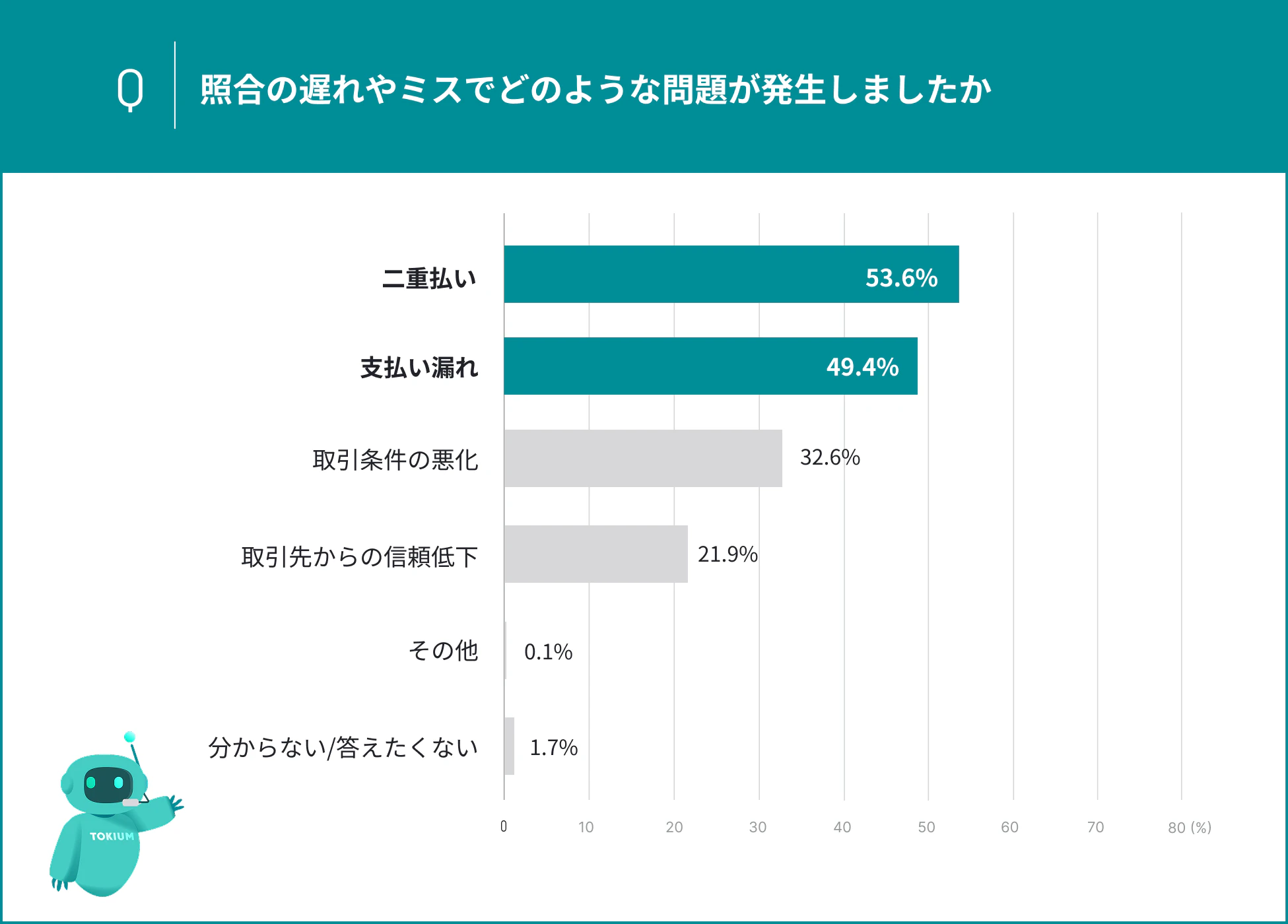 照合作業の遅れやミスにより、86.6%の企業でなんらかの問題が実際に発生していることがわかりました。具体的には、「二重払い」(53.6%)や「支払い漏れ・遅延」(49.4%)などの問題が発生していることがわかっています。