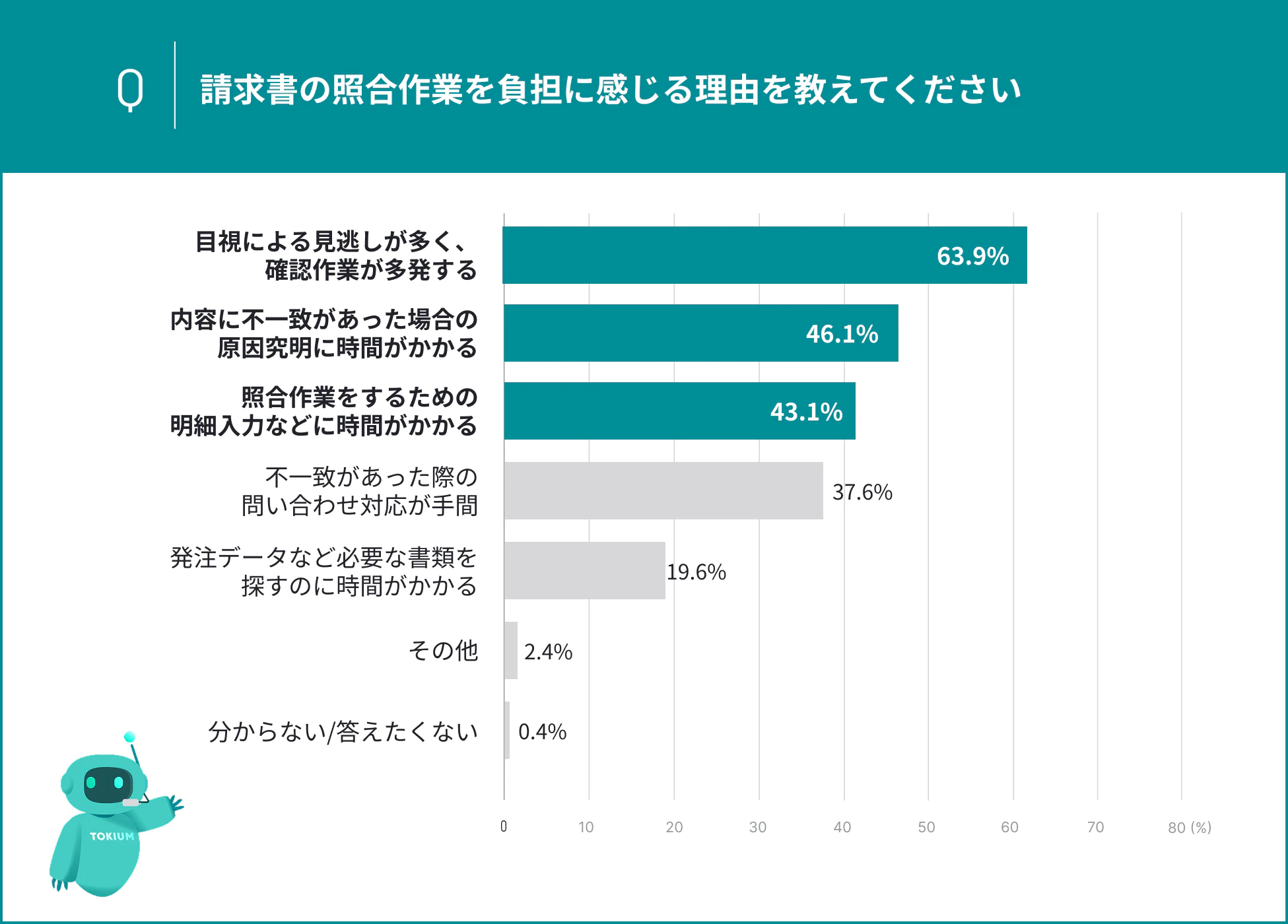 請求書の照合を負担に感じる理由として、「目視による見逃しが多く、確認が多発する」(63.9%)や「内容に不一致があった場合の原因究明に時間がかかる」(46.1%)、「照合をするための明細入力などに時間がかかる」(43.1%)が多くあげられています。