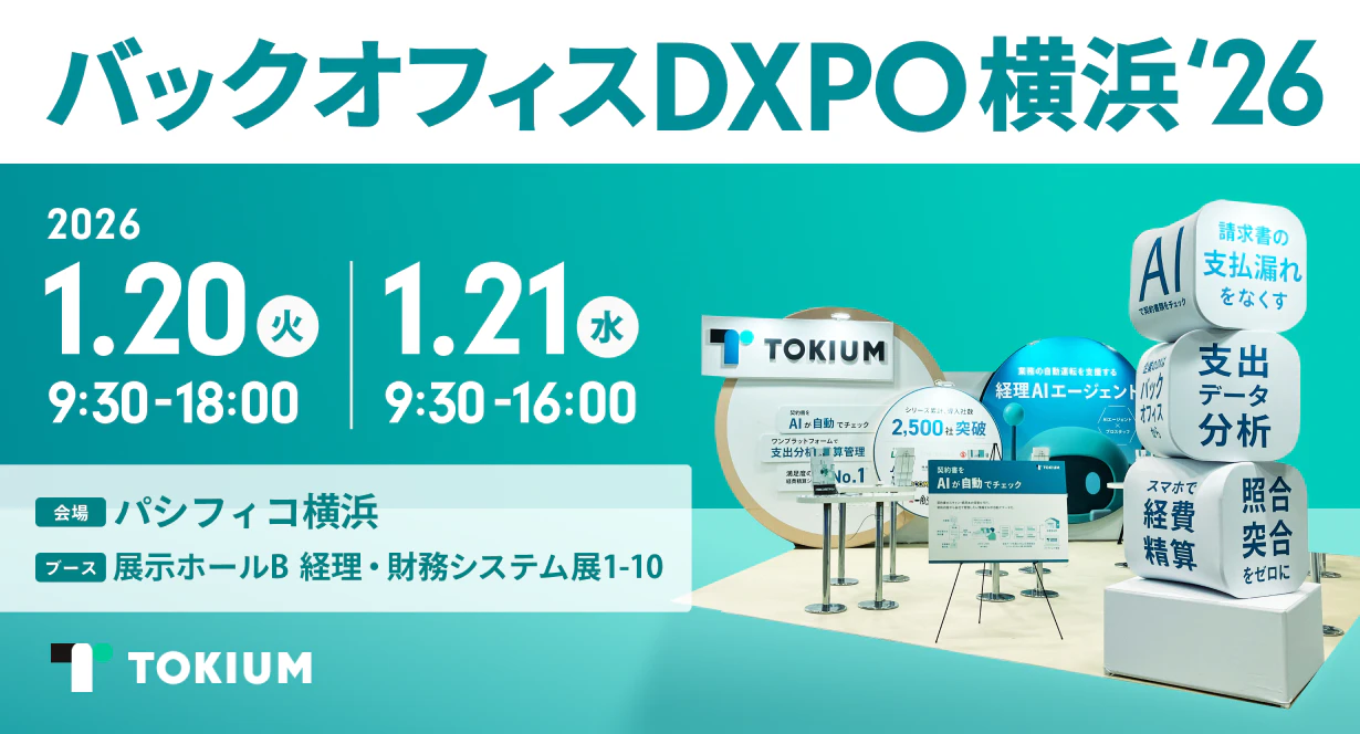 経理AIエージェントを提供する株式会社TOKIUM(本社:東京都中央区、代表取締役:黒﨑 賢一、以下「TOKIUM」)は、2026年1月20日から1月21日までの2日間、パシフィコ横浜で開催される「バックオフィスDXPO」に出展いたします。