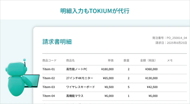 照合に必要な請求書データや納品書データの明細作成も、TOKIUMが代行します*。