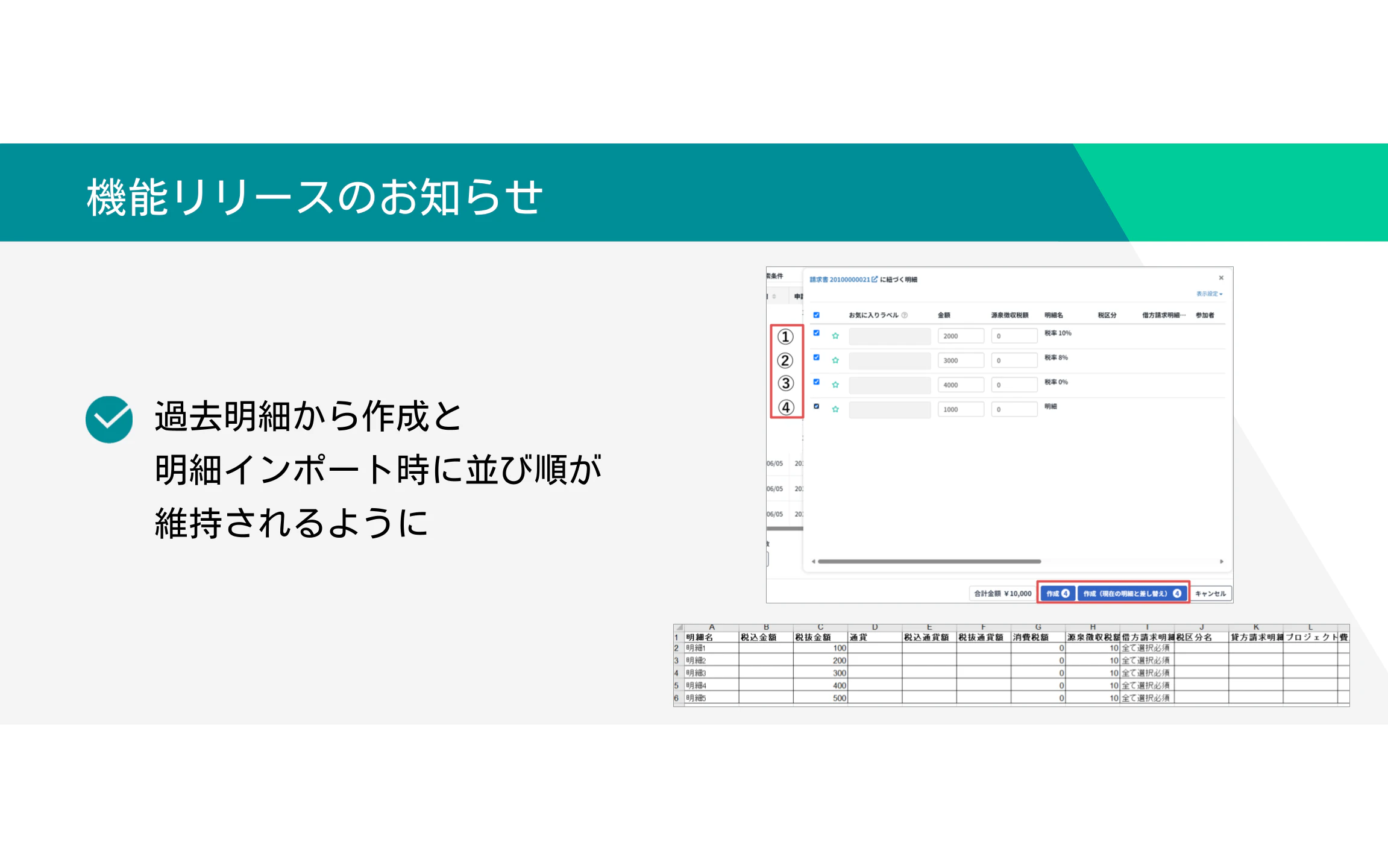 これにより、明細の並び順を過去の明細データや請求書の記載内容と確認がしやすい順に調整することができるようになります。