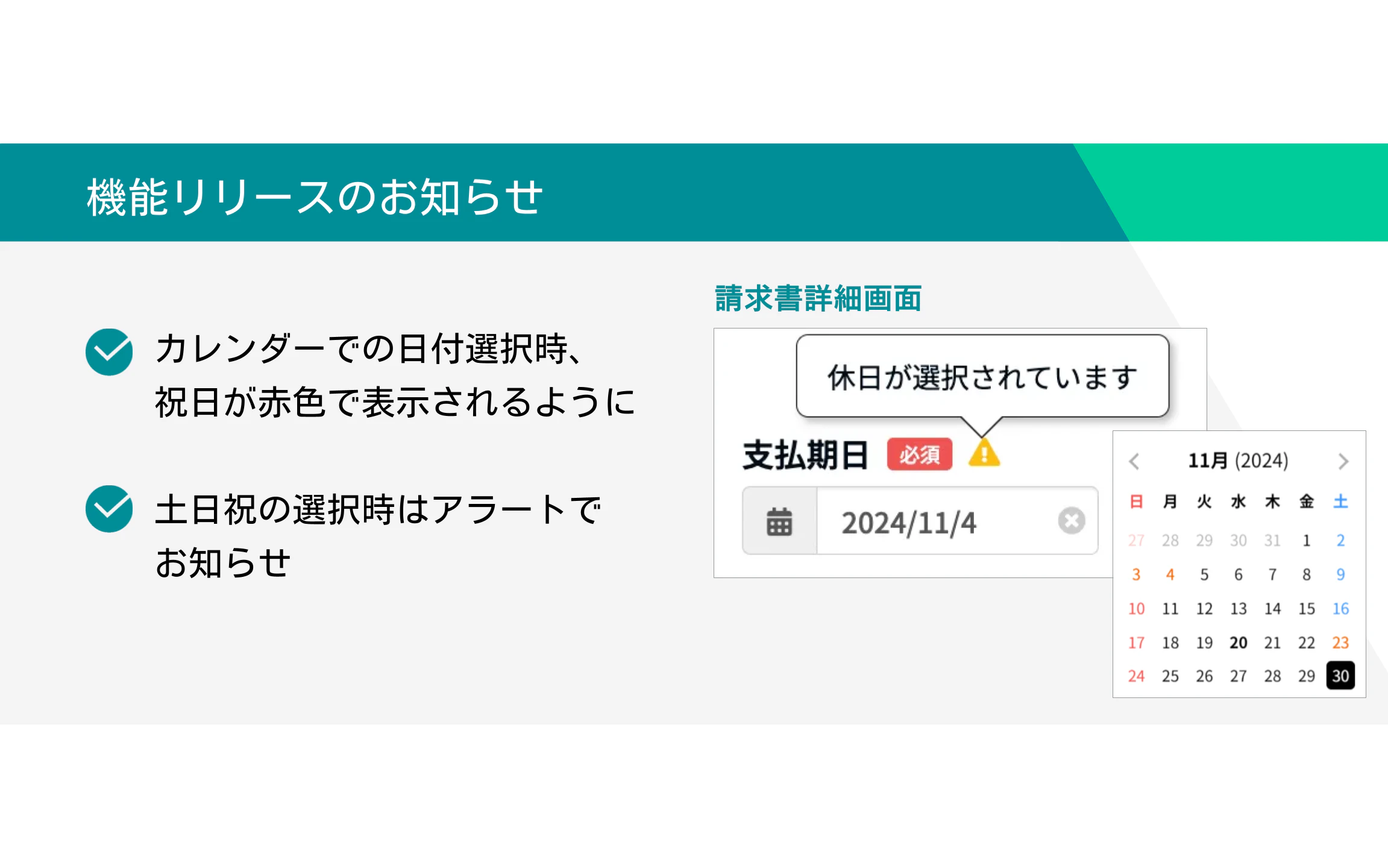 請求書の詳細画面のカレンダーにて、祝日が赤色で表示されるようになりました。