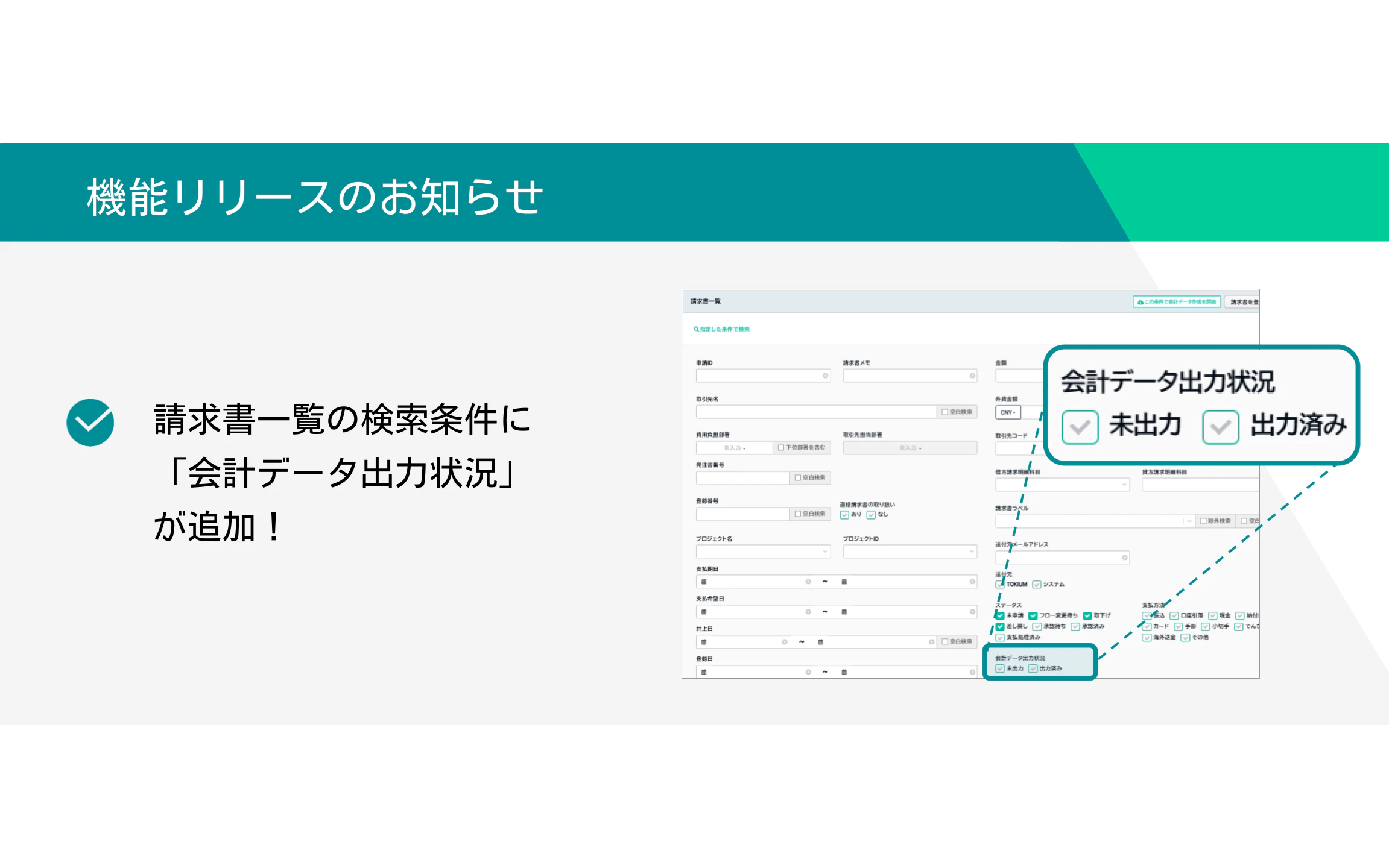 請求書一覧の検索で「会計データ出力状況」が利用できるようになりました。