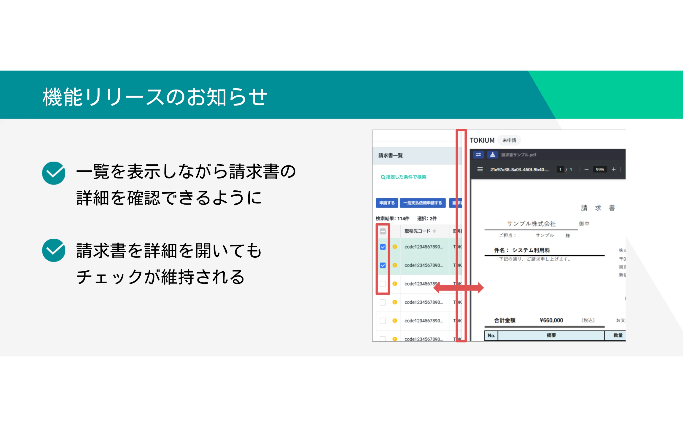 これにより、一覧画面でチェックを入れながら請求書の詳細を確認いただくといった使い方が可能です。
