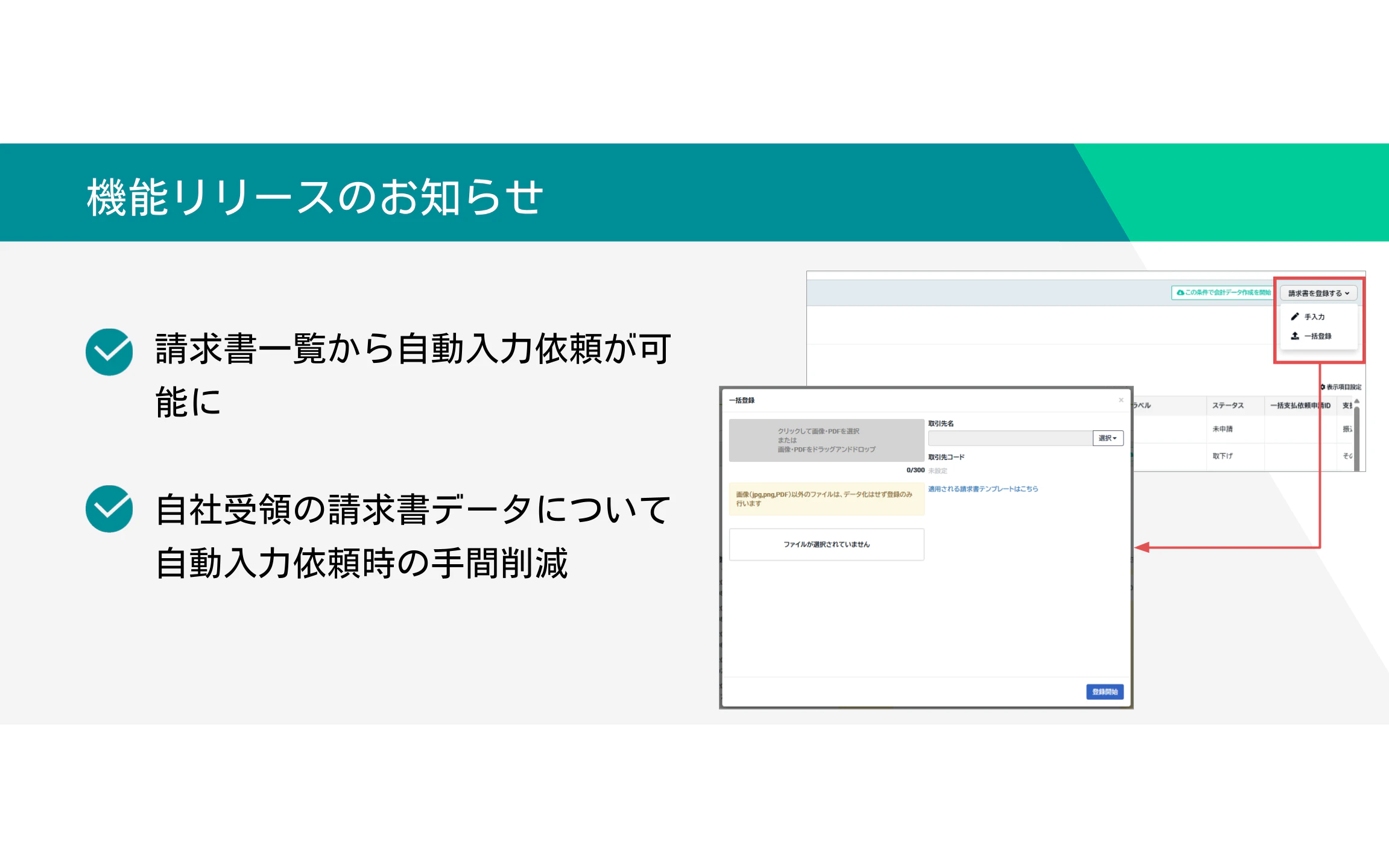 請求書一覧の「請求書を登録する」ボタンより、一括で自動入力依頼をすることが可能になりました。これにより、TOKIUM画面とアップロードサイトを行き来せずとも、自社受領の請求書を自動入力にてデータ化依頼することができるようになります。