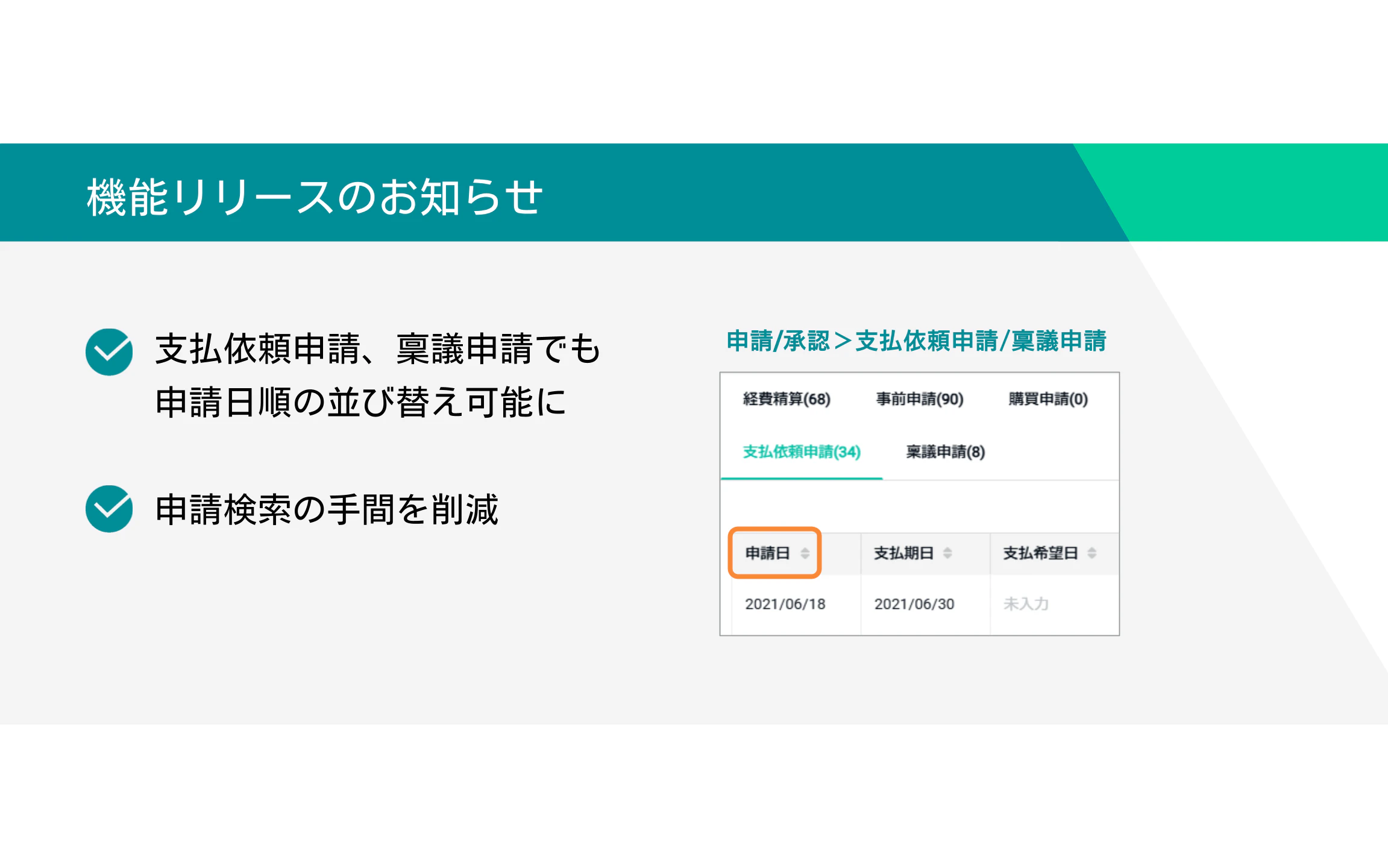 「支払依頼申請」「稟議申請」で申請日順の並び替えができるようになりました。