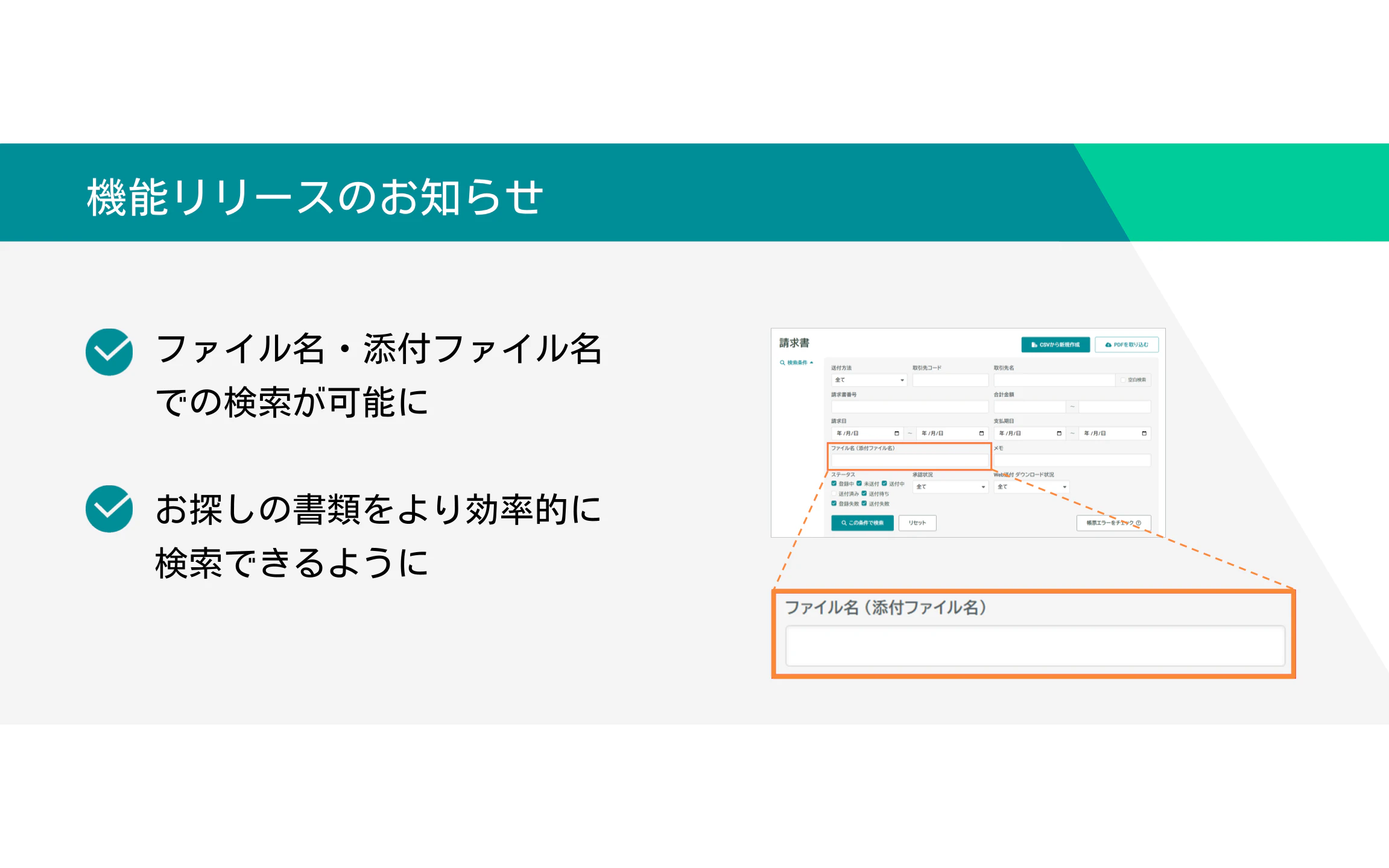 このたび、請求書をファイル名、もしくは添付ファイル名で検索できるようになりました。