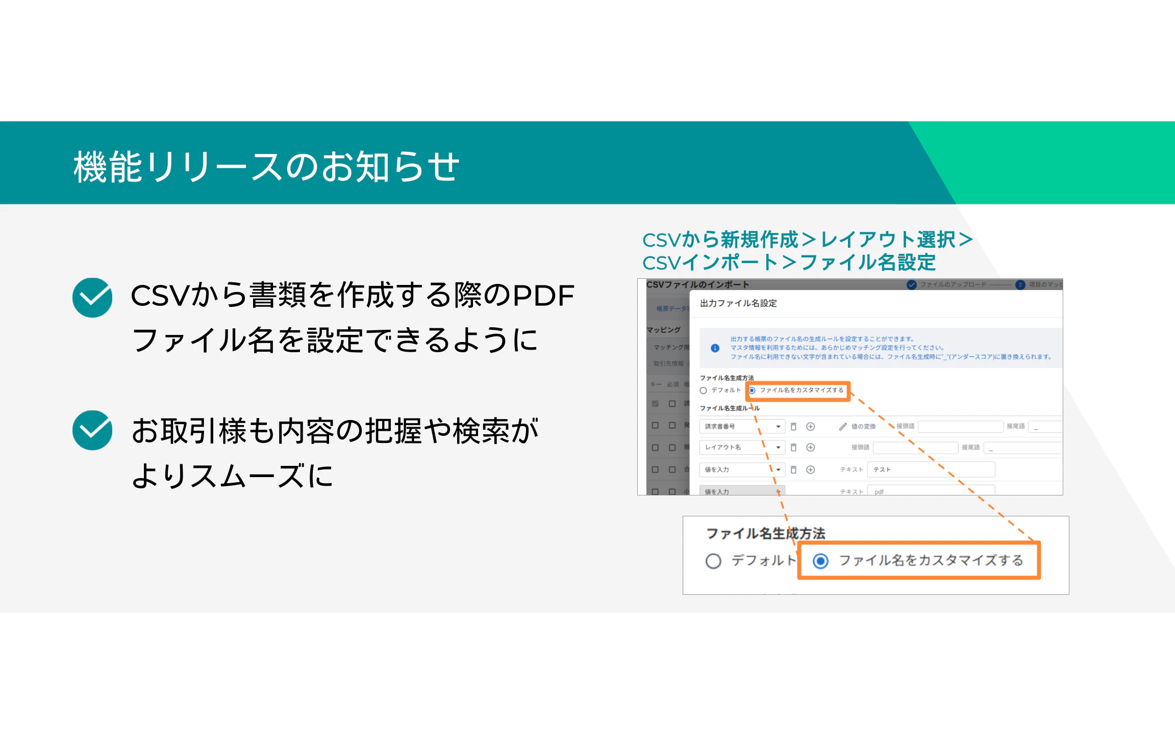 帳票を受領するお取引先様もファイル名を見るだけで、内容の把握や検索がしやすくなります。