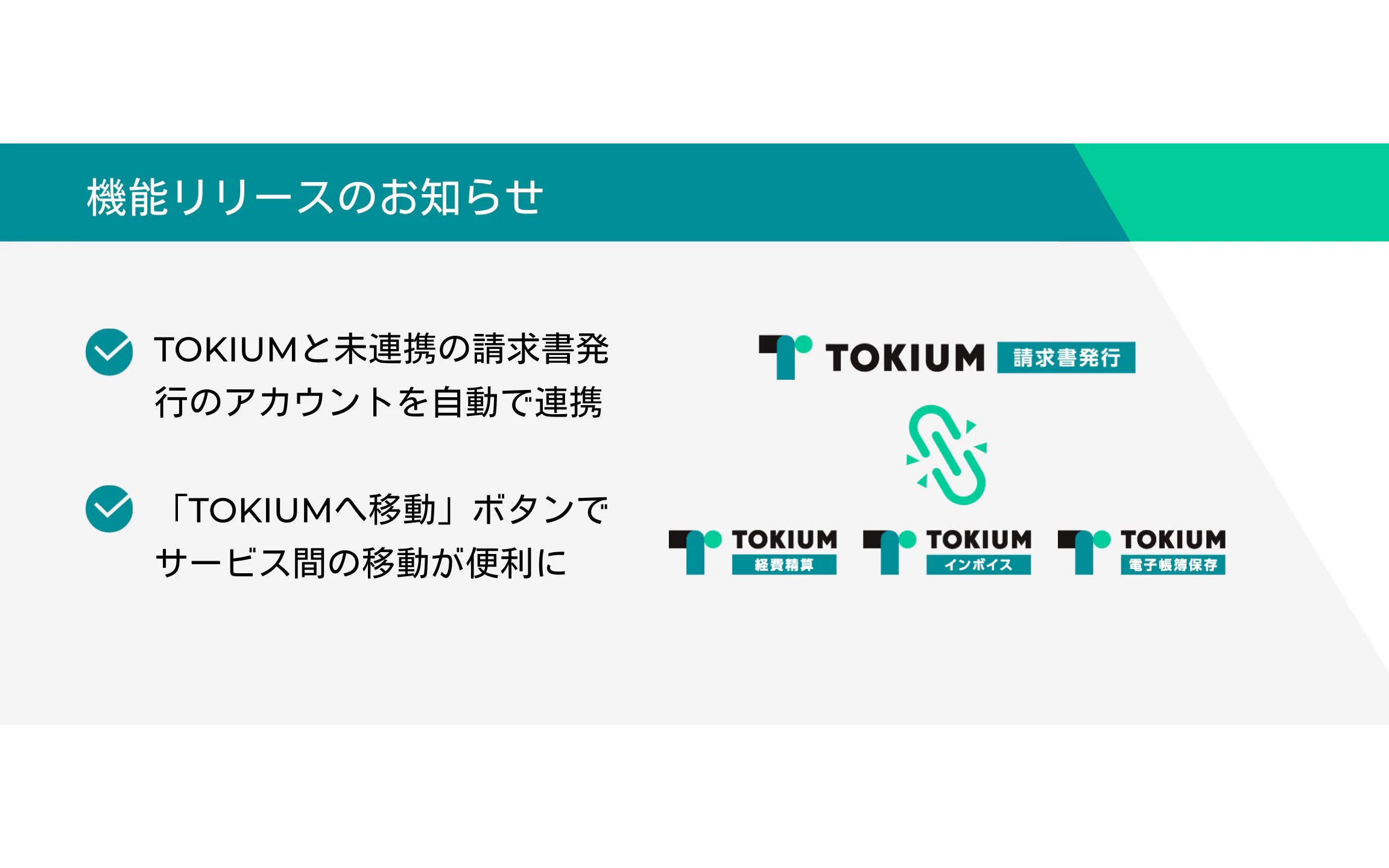 このたび、TOKIUM請求書発行のアカウントが「TOKIUM」本体アカウントと自動で連携されるようになりました。 これにより、連携完了後は対象ユーザーの画面に「TOKIUMへ移動」ボタンが自動で表示され、スムーズなサービス間移動が可能となります。