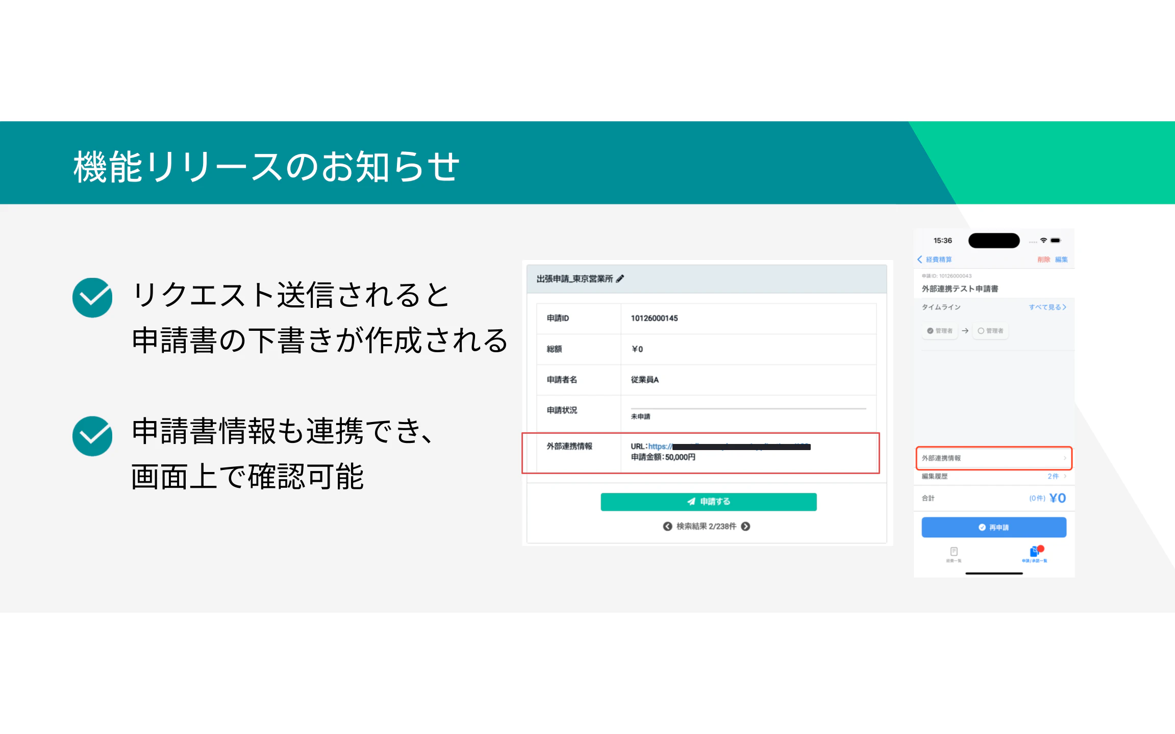経費申請の詳細画面にある [外部連携情報] で、事前申請の内容を直接確認できます。