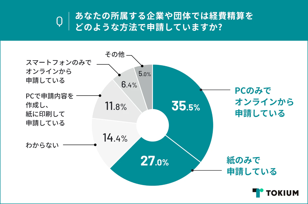 次にどのような方法で経費精算の申請を行っているのかも調査を行ったところ、最も多いのは「PCのみでオンラインから申請している」で35.5%、続いて「紙のみで申請している」で27.0%という結果になりました。一方で、「スマートフォンのみでオンラインから申請をしている」と回答したのは、全体のわずか6.4%となり、場所を選ばずに経費精算ができないことによって、出社が発生していると考えられます。