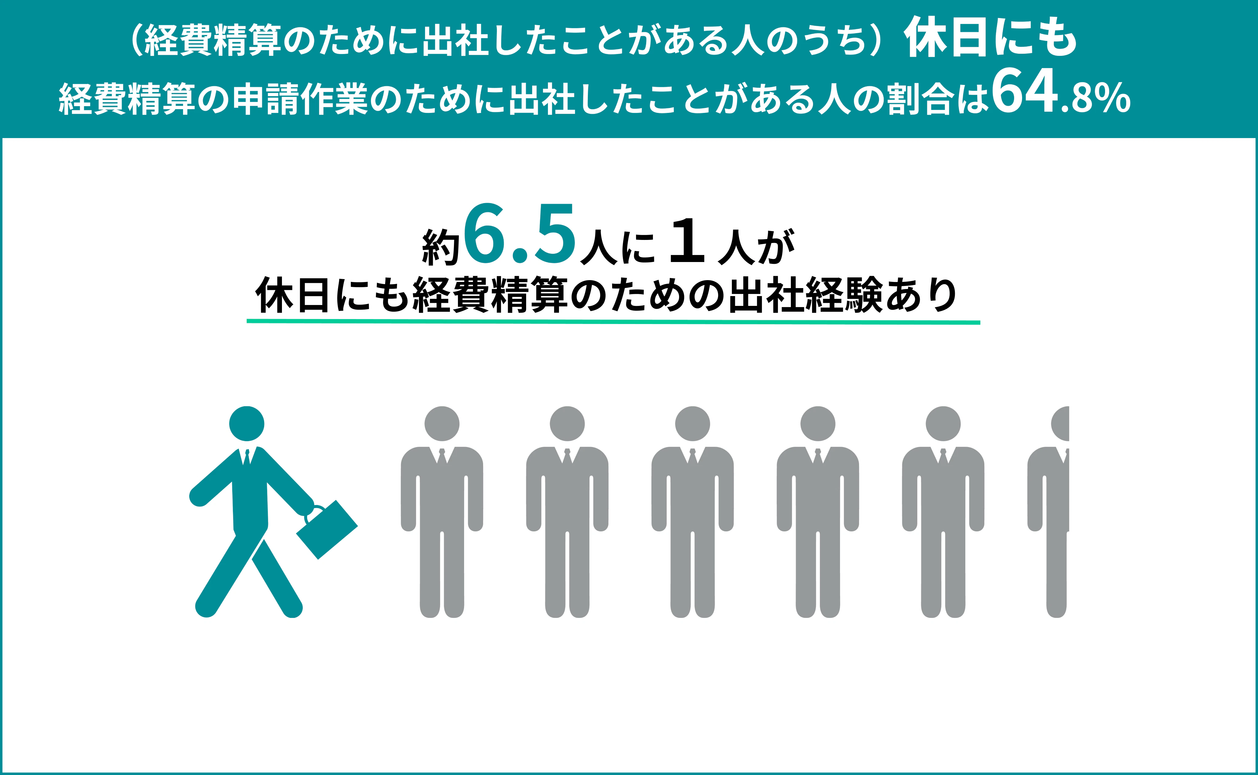 さらに、「経費精算出社」をしたことがあると回答した人のうち64.8%は、会社が定めた休日にもかかわらず、経費精算の申請のために出社をしたことがあると回答しており、これは約6.5人に1人の割合となります。