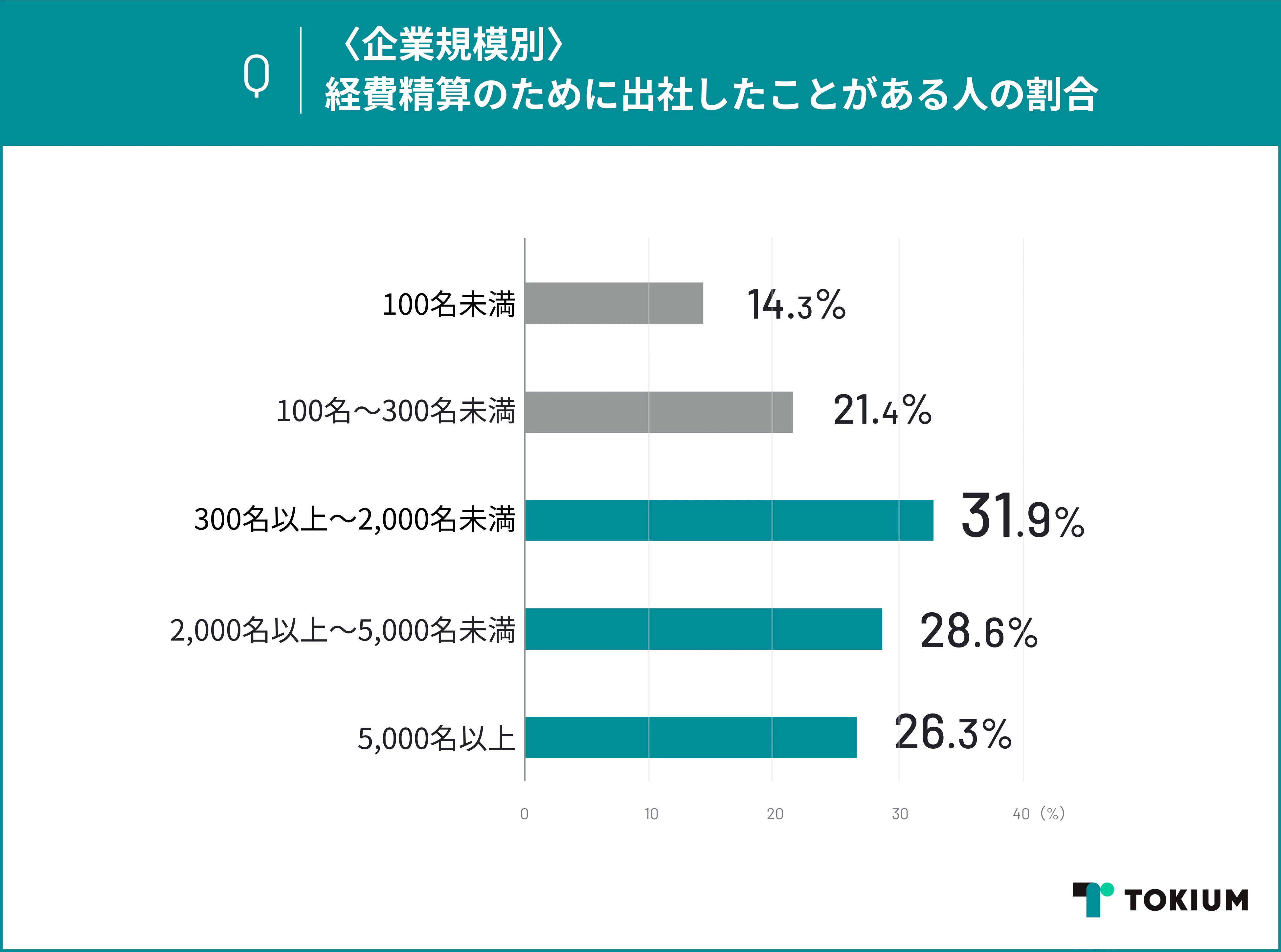 次に、企業規模がどの程度「経費精算出社」に影響を与えているのかという観点で分析をしたところ、31.9%で「300名以上〜2,000名未満」が最も多くなりました。続いて28.6%で「2,000名以上〜5,000名」、26.3%で「5,000名以上」という結果となり、中堅企業から大企業を中心に「経費精算出社」が発生していることが明らかになりました。