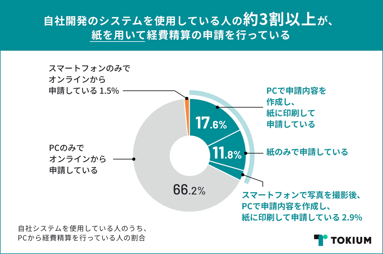 また、自社開発のシステムを利用している人の32.3%が経費精算の申請に紙を用いていると回答し、スマホのみで完結している場合が全体に比べて4分の1程度となっています。このことからも、自社開発のシステムを利用している場合には特に経費精算のための出社が発生し、営業活動にも支障をきたす要因の1つになっていることが考えられます。