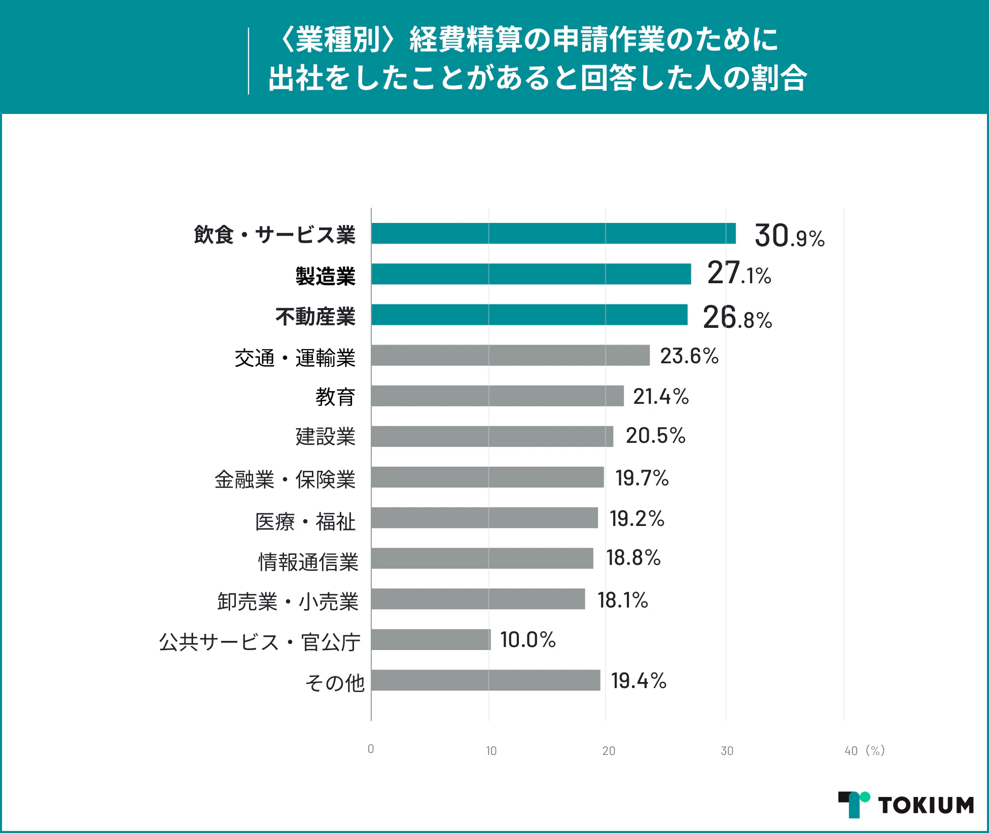 業界ごとに「経費精算出社」をしたことがあると回答した人の割合を比較したところ、飲食・サービス業が30.9%と最も割合が高い結果となりました。続いて、27.1%で製造業、26.8%で不動産業という結果となりました。