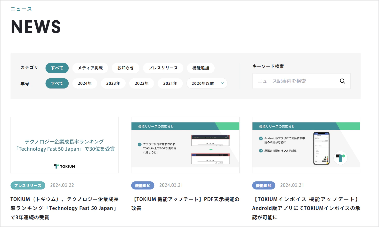 TOKIUMのブランドカラーやフォントなどを見直し、よりTOKIUMのブランドを感じられるサイトに仕上げています。また、見たい情報にすぐにアクセスできるようわかりやすい導線を意識するとともに、ニュースページの検索機能を追加するなど、UIの刷新をおこなっています。