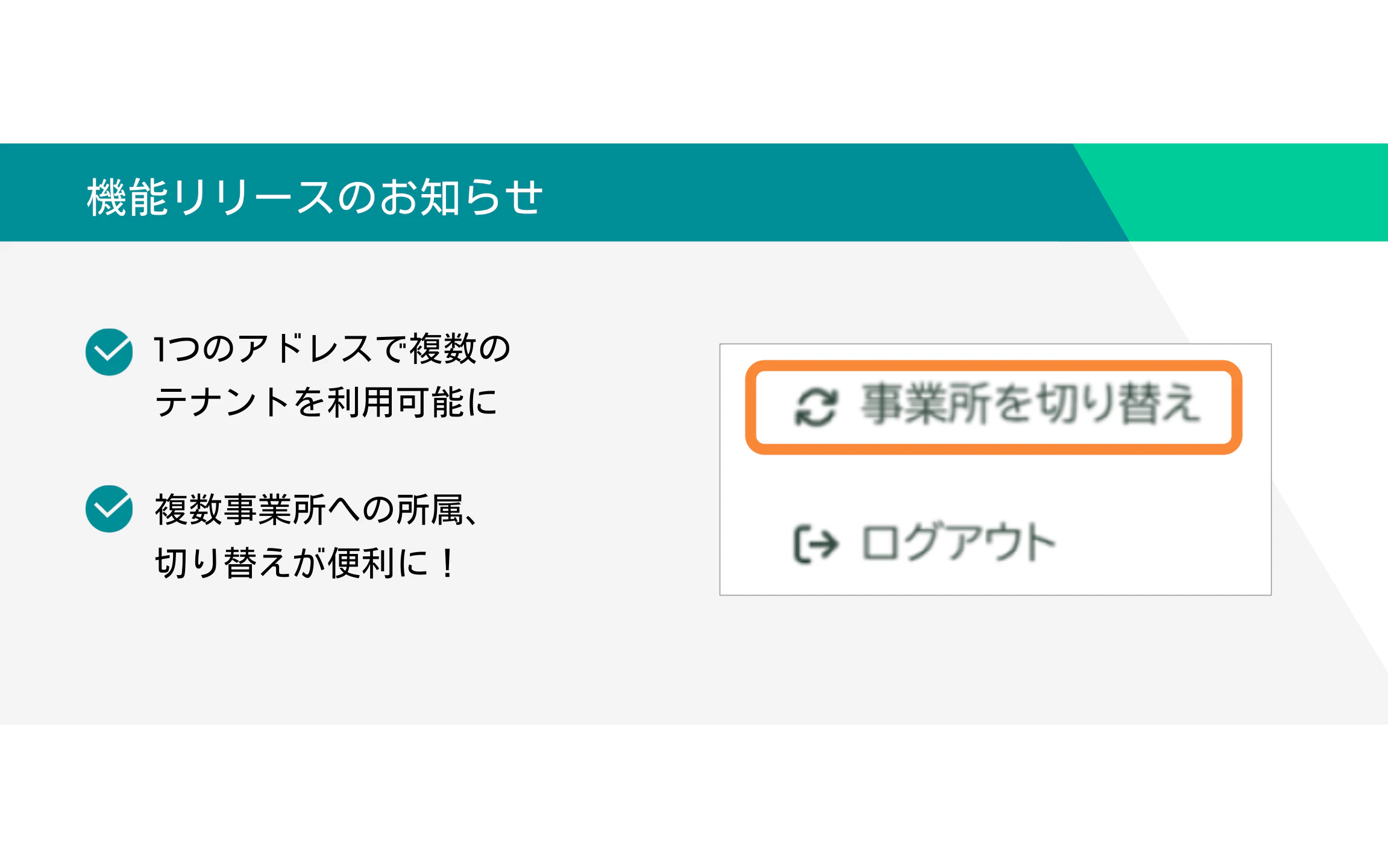以前は一つのメールアドレスにつき、一つのテナントにしか所属できませんでしたが、これからは複数の事業所を使い分けることが可能です。