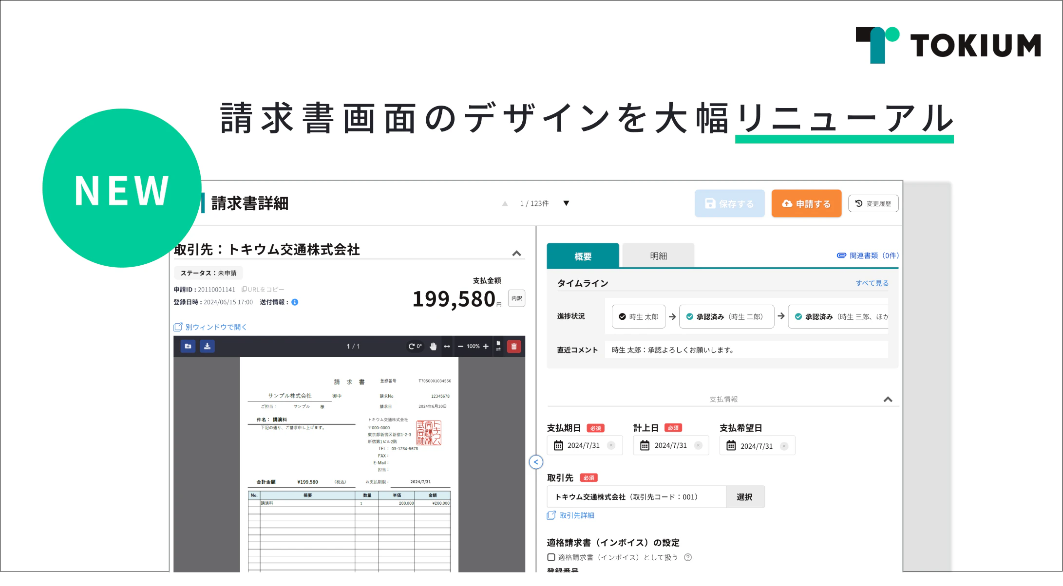 経費精算や請求書処理などの支出管理にまつわるクラウドサービスを提供する株式会社TOKIUM(本社:東京都中央区、代表取締役:黒﨑 賢一、以下「TOKIUM」)は、請求書受領クラウド「TOKIUMインボイス」の請求書画面のデザインを大幅にリニューアルしたことをお知らせいたします。